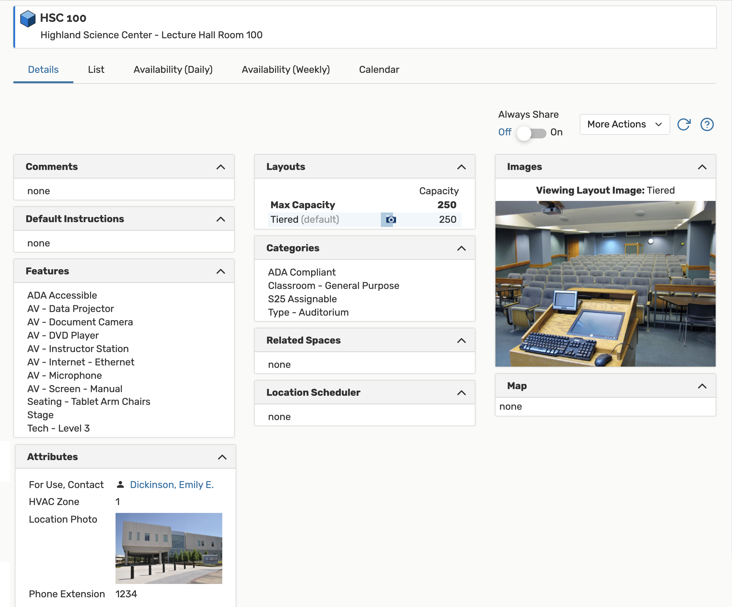 This is an example of a location as it appears in 25Live. The location data was entered and the photograph selected in the 25Live Administration Utility when the location was created.