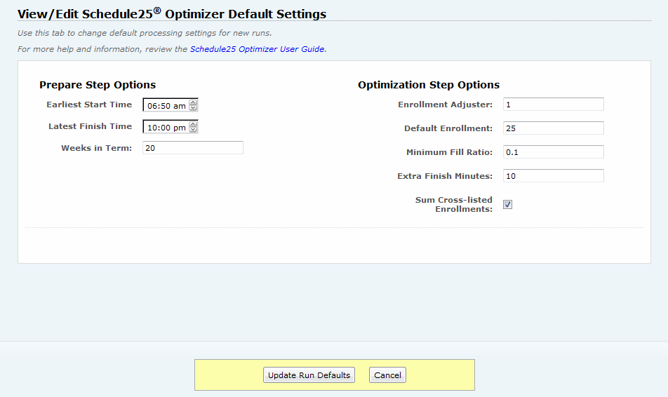 The View/Edit Schedule25 Optimizer Default Settings page of the 25Live Administration Utility is used to define default settings used to control Optimizer processing, such as the minimum percentage of seats in a location that must be filled by any Optimizer placement and how the Optimizer should treat the enrollments of events in binding space assignment relationship groups. The page lists those settings that influence the Prepare step of a run and those settings that influence the Optimization step of a run.