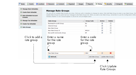 1. In the 25Live Administration Utility, select the Pricing tab, then select the Rate Groups task tab.