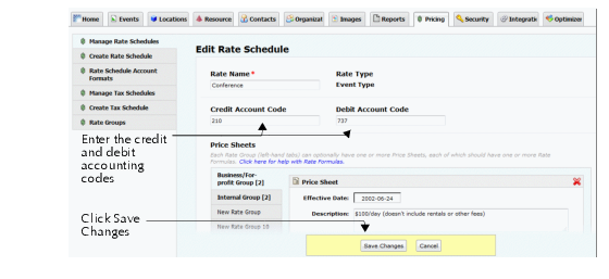 1. In the 25Live Administration Utility, select the Pricing tab, then select the Manage Rate Schedules task tab.