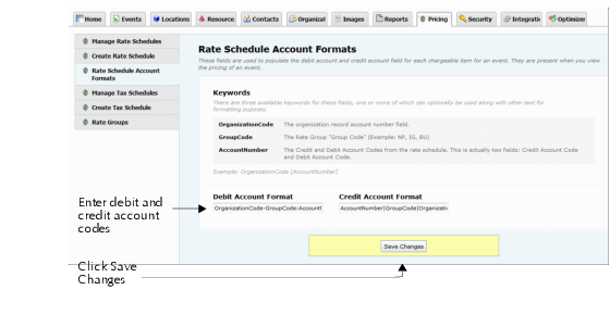 1. In the 25Live Administration Utility, select the Pricing tab, then select the Rate Schedule Account Formats task tab.