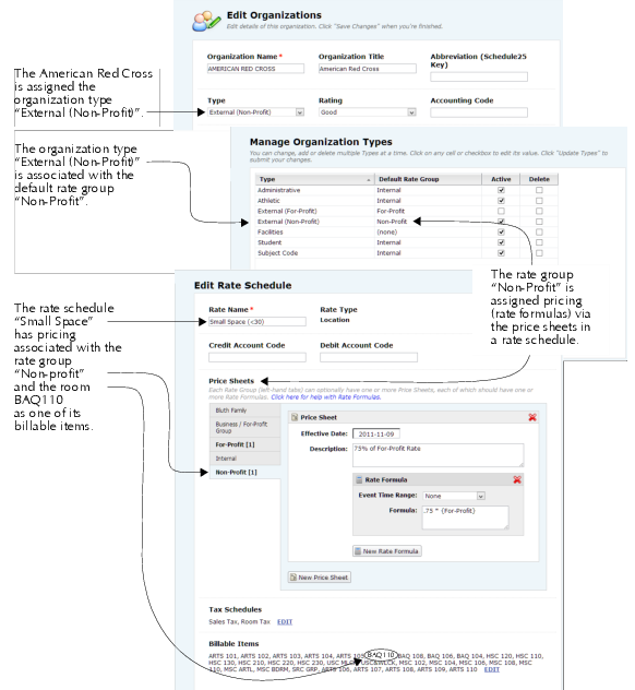 You can associate an organization type with a default rate group. This allows pricing to be automatically applied to events based on the corresponding rate schedule for the default rate group associated with the event’s primary organization’s type.
